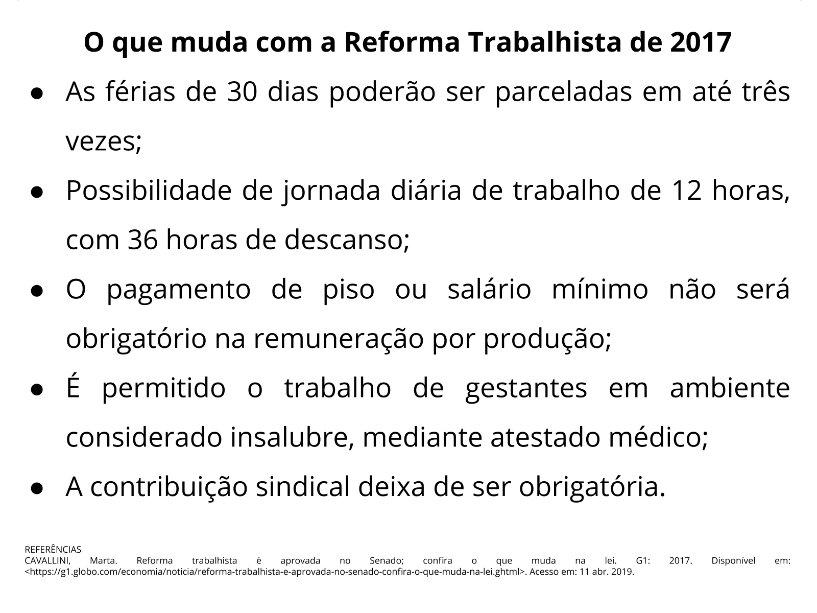 Plano De Aula 9º Ano Direitos Trabalhistas Na Era Vargas E A Nova Reforma Trabalhista from nova-escola-producao.s3.amazonaws.com A consolidação das leis de trabalho é um grande guia para empresas e indivíduos, afinal, é nela que estão descritos todos os. Principais mudanças com a reforma trabalhista: Como falamos, a reforma trabalhista apresentou cerca de 100 alterações na clt, e abordamos aqui as principais mudanças que você precisa saber para manter o vínculo entre empregado e empregador de acordo com a legislação. Comentários ao substitutivo do projeto de lei 6787/16 vólia bomfim cassar 1 resumo a reforma trabalhista é uma imposição do atual governo, que começou timidamente com um projeto de poucos artigos e se transformou num monstrengo jurídico consubstanciado, hoje, no substitutivo do projeto de lei 6787/16. A reforma trabalhista e seus impactos para os peuenos negócios 3 introdução a lei nº 13.467/2017, conhecida como lei da reforma trabalhista, apresentou inúmeras alterações nas relações de trabalho, bem como regulamentou temas de extrema relevância. A lei 13.467/2017, publicada em 14/07/2017, alterou mais de uma centena de pontos da clt e trouxe várias mudanças que afetam o dia a dia entre empregado e empregador, outras que abrangem as relações sindicais, além de outras que envolvem questões judiciais decorrentes de reclamatórias trabalhistas. Foi aprovada a reforma trabalhista e sancionada pelo presidente michel temer em 13/07/2017. Enfim ocorreu a tão propalada reforma trabalhista.